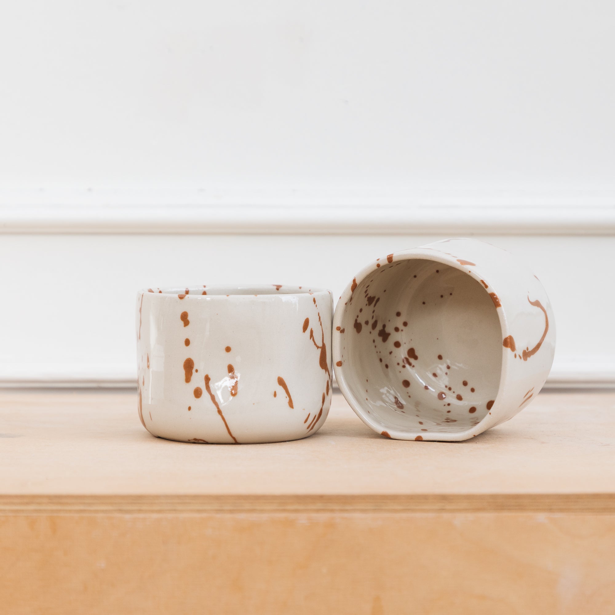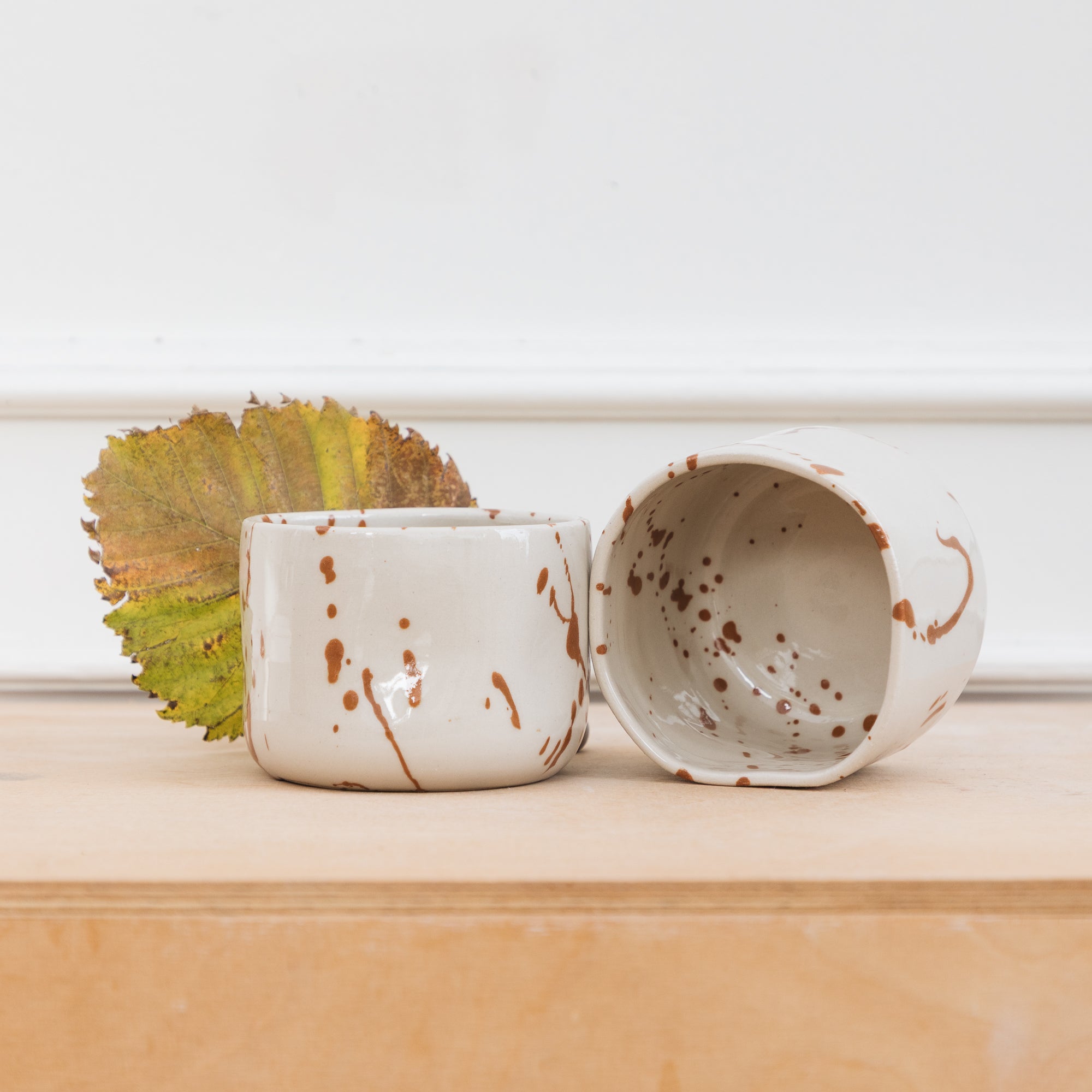 Der Becher wurde mit einem hellen Steinzeugton von Hand auf der Töpferscheibe gedreht. Gleich im Anschluss wurde er durch Druck unserer Hände unterschiedlich verformt, weshalb die sehr organische Form entsteht. Erhältlich ist er mit immer unterschiedlich ausfallenden haselnussfarbigen Farbspritzern oder in einem samtigen creme.