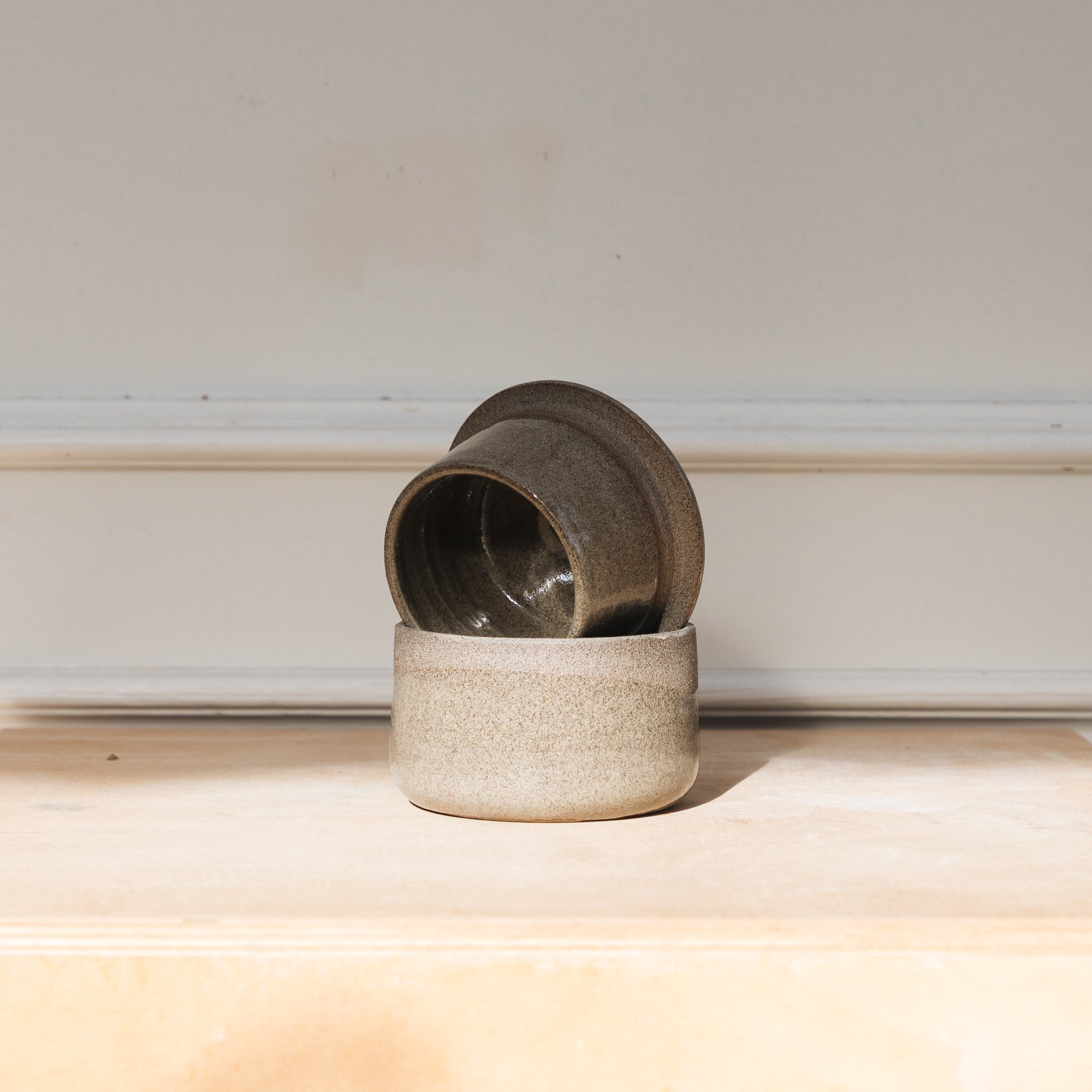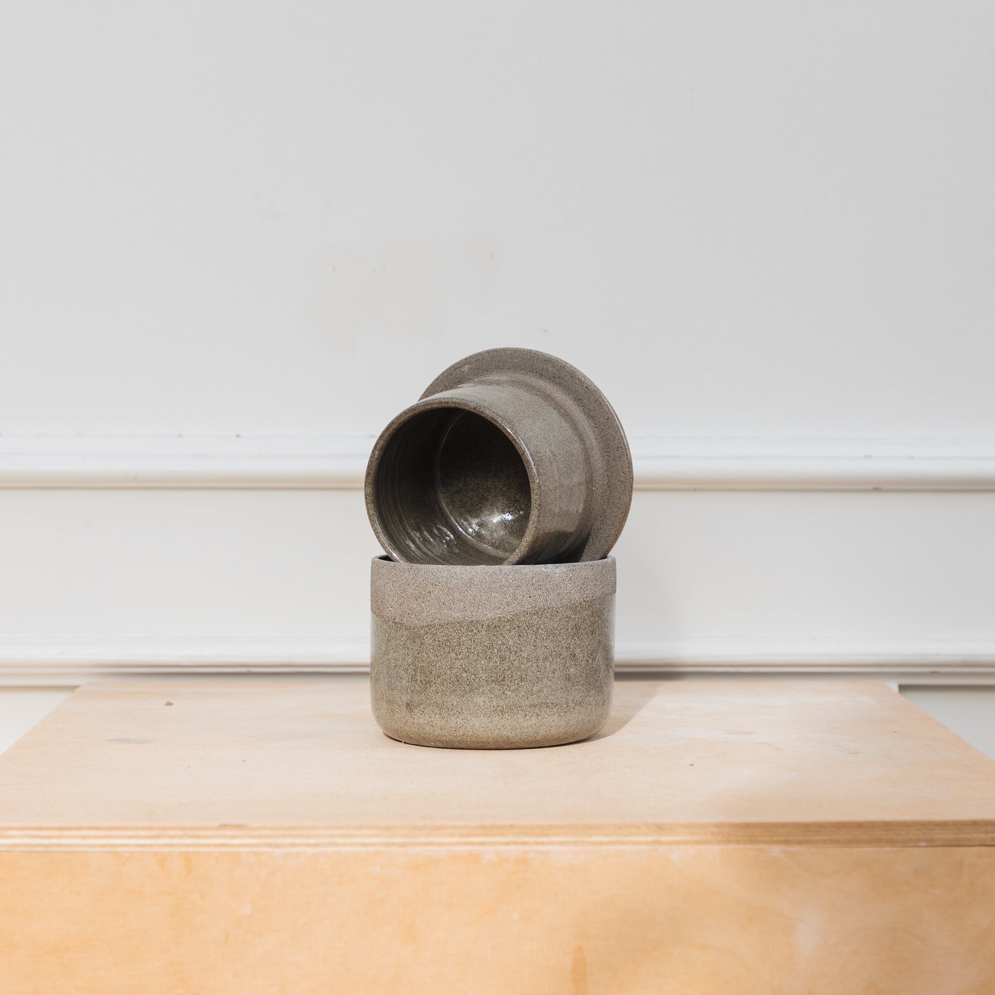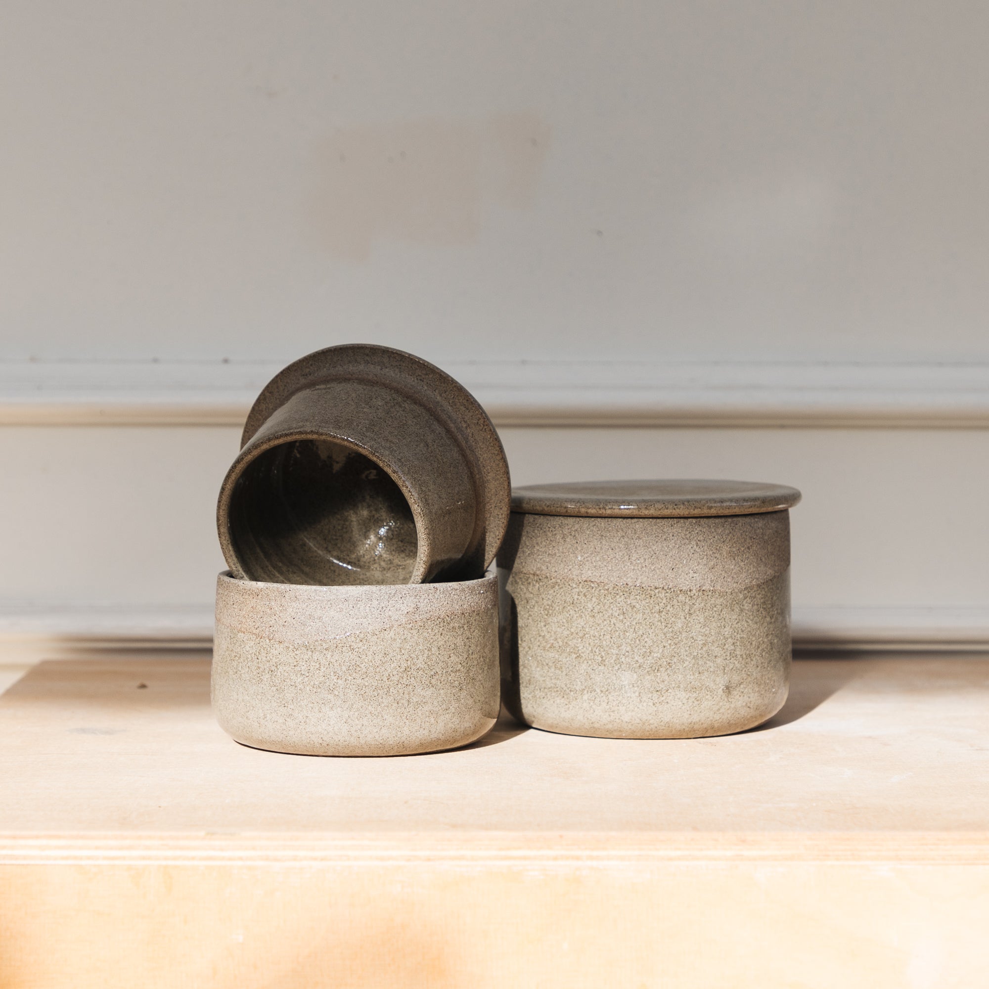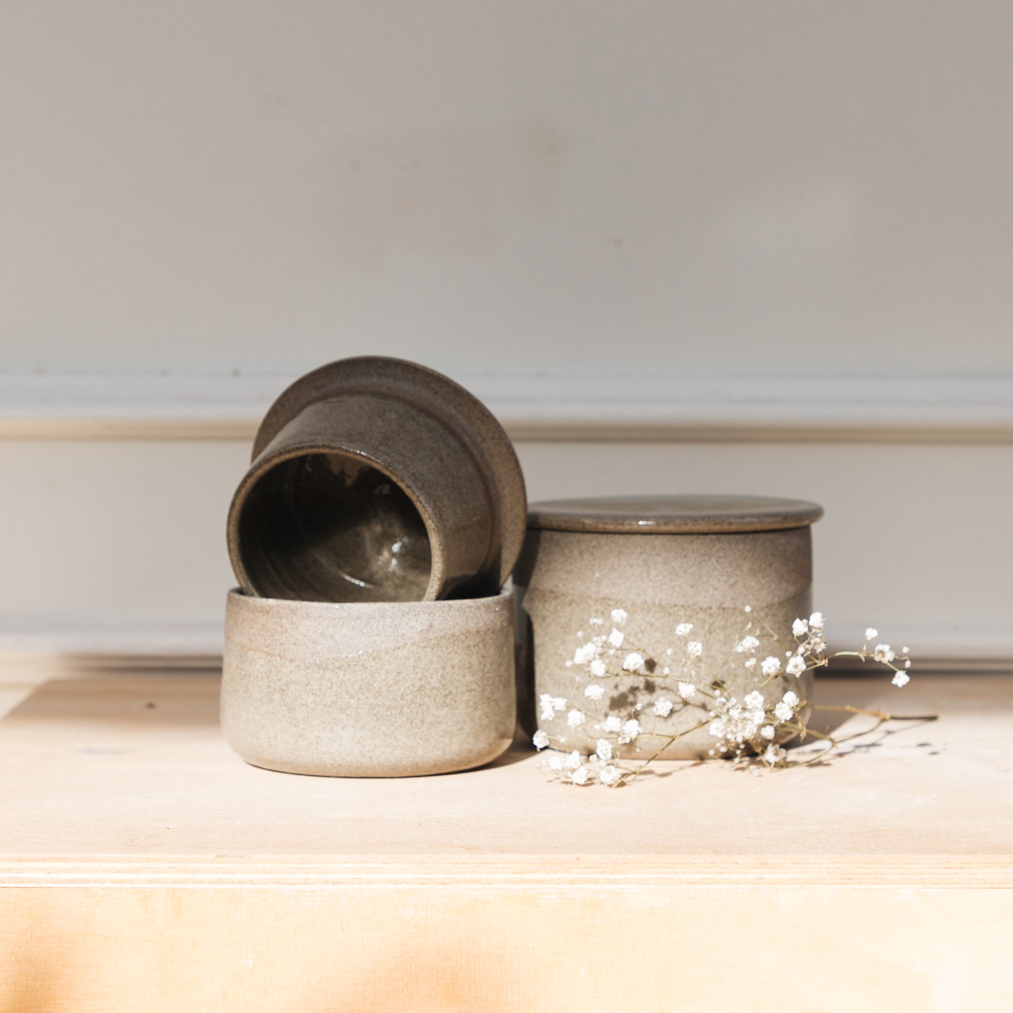 Die Dosen wurden mit einem anthrazitfarbenen Steinzeugton von Hand auf der Töpferscheibe gedreht.