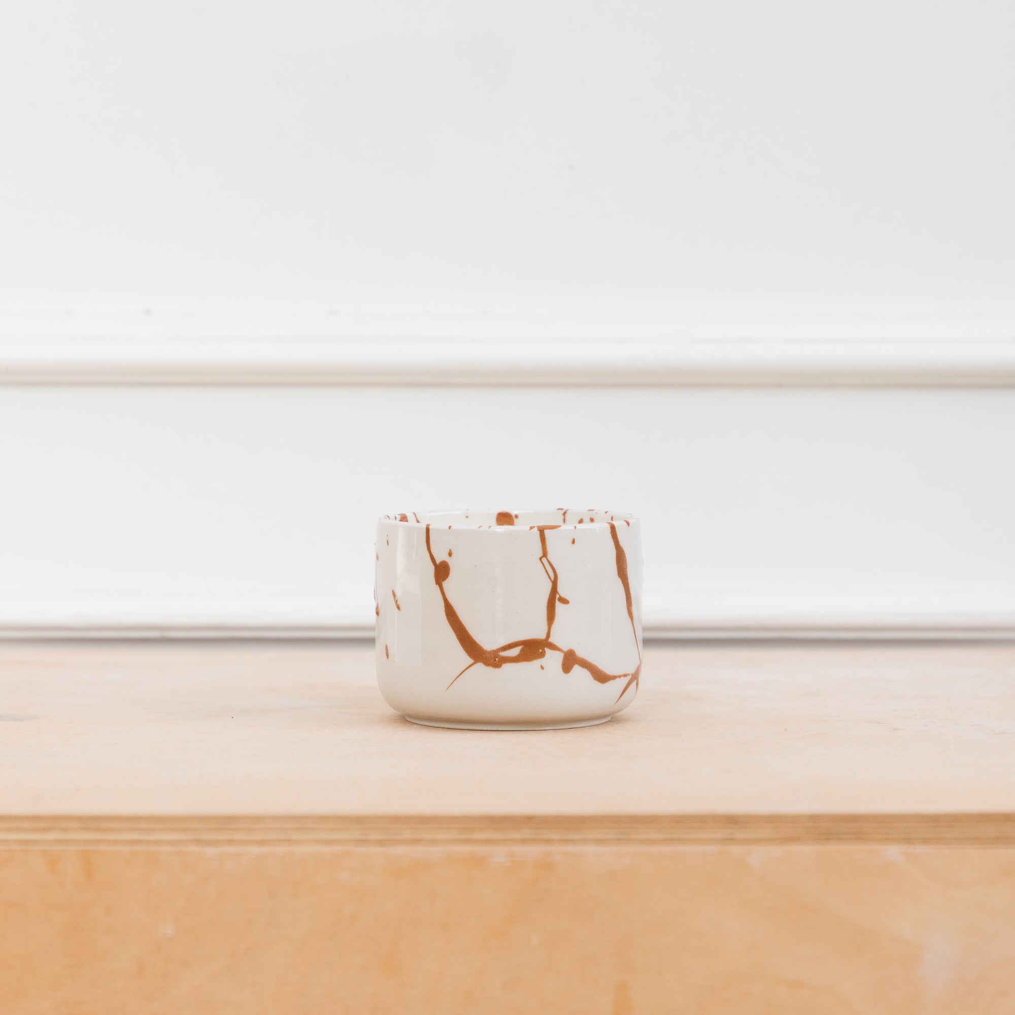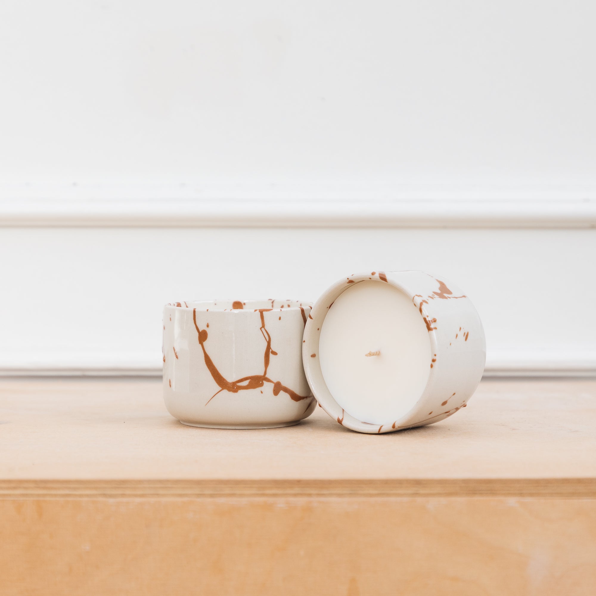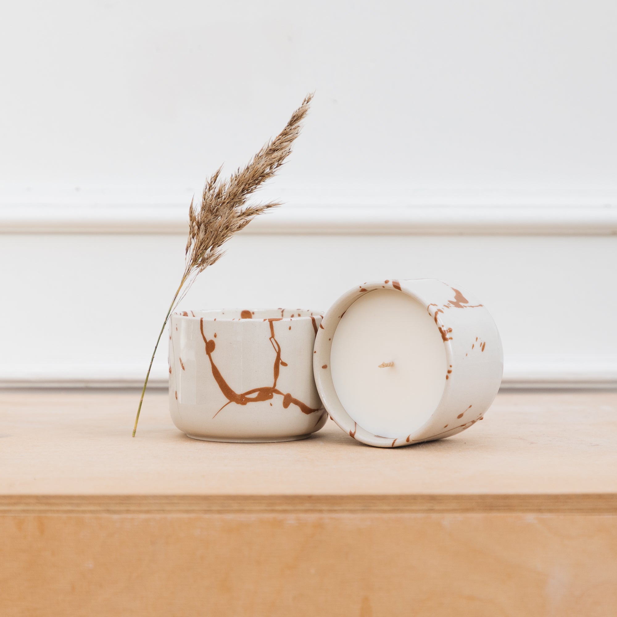 Der CANDLE CUP entstand in Kooperation mit Duft & Fein aus Würzburg. Zunächst wurde der Becher mit verschiedenen Steinzeugmassen von Hand auf der Töpferscheibe gedreht. Erhältlich ist er in einer anthrazitfarbenen Tonmasse und in einer hellen, die mit immer unterschiedlich ausfallenden haselnussfarbigen Farbspritzern versehen wurde.