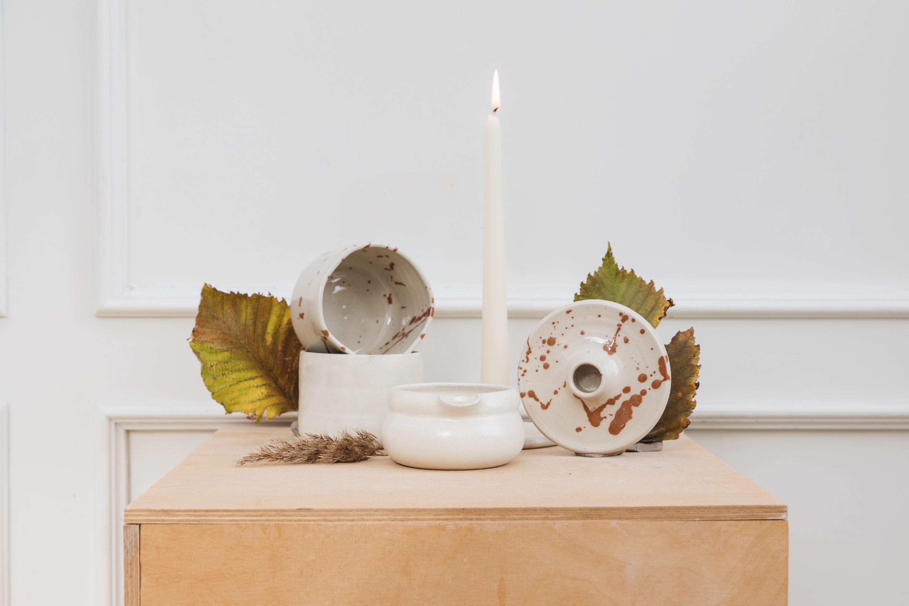 Der Kerzenständer wurde mit einem hellen Steinzeugton von Hand auf der Töpferscheibe gedreht. Erhältlich ist er mit immer unterschiedlich ausfallenden haselnussfarbigen Farbspritzern oder in einem samtigen creme.
