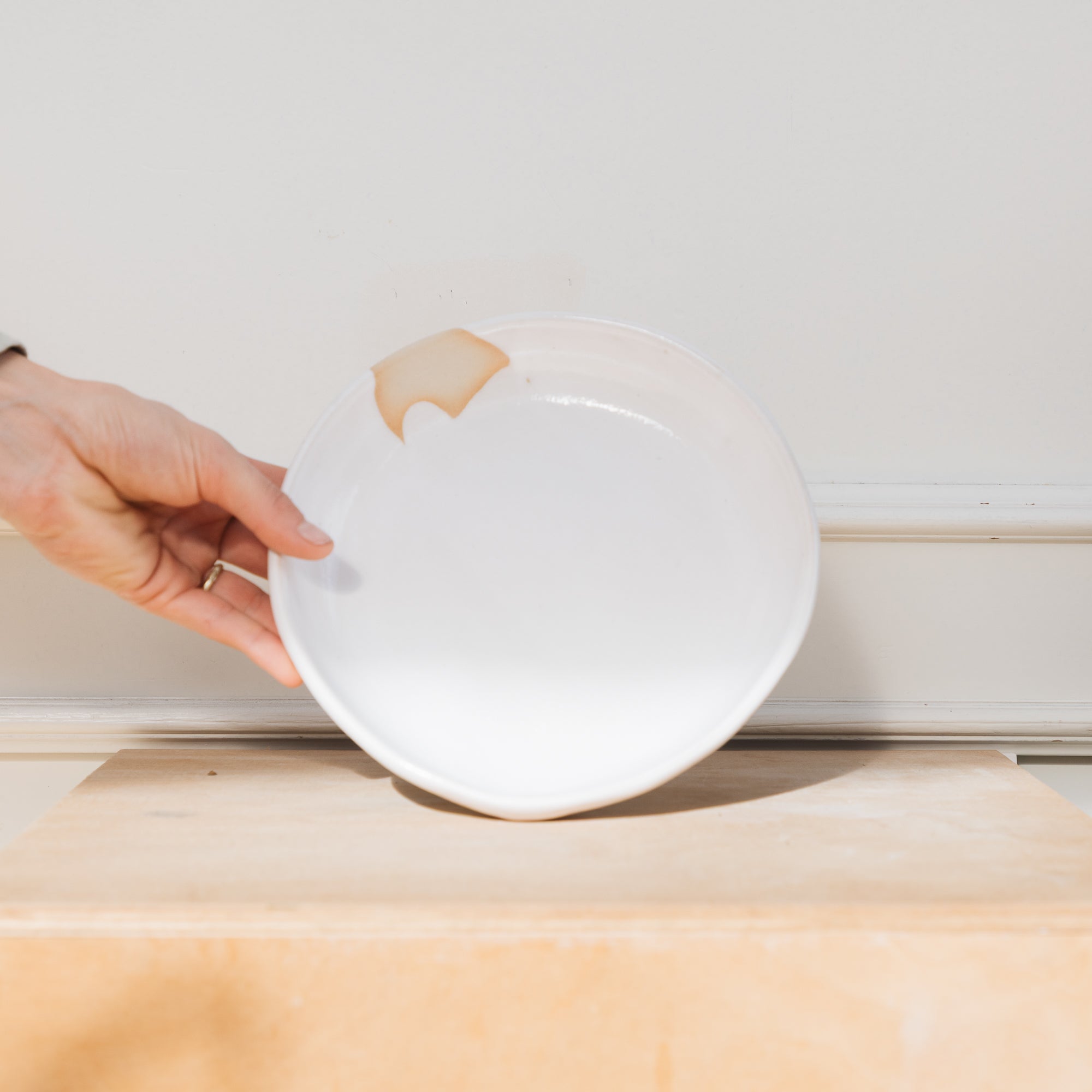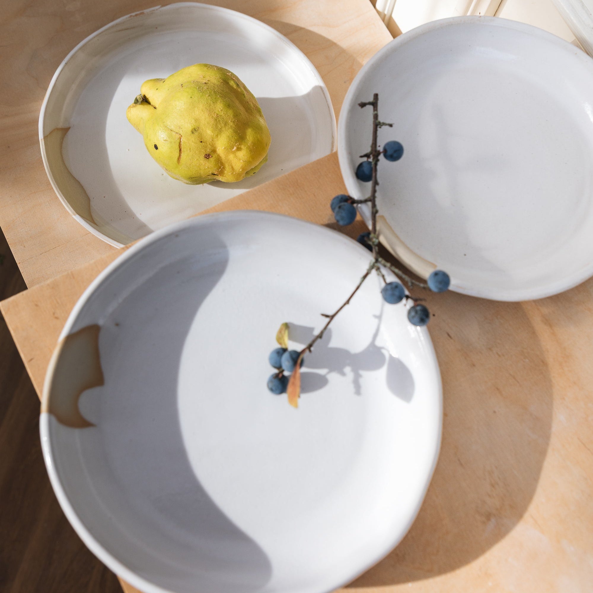 'Momo' wurde mit einem hellen Steinzeugton von Hand modelliert. Erhältlich ist der tiefe Teller mit einer weißen Glasur, die am Übergang zum Ton ins beige übergeht. Bei dem genutzten Glasurverfahren wird der Teller mit der Glasur übergossen - eine kleine Stelle am Rand bleibt immer unglasiert. Die zweite Variante wurde mit schwarzen Spots versehen. Der kleine Teller ist perfekt für ein Müsli/Porridge oder kleinen Salat, der mittlere Teller eignet sich gut für Pasta und den großen nutzen wir gerne zum Anrichten oder bspw. für Tomate-Mozzarella.