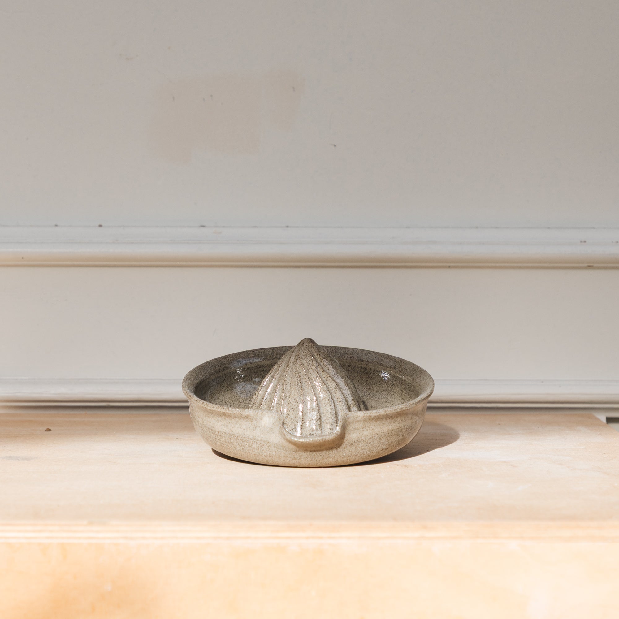 Die Zitruspresse wurde mit zwei unterschiedlichen Steinzeugmassen von Hand auf der Töpferscheibe gedreht. Erhältlich ist sie mit einem hellen Ton und immer unterschiedlich ausfallenden schwarzen Spots oder in einem anthrazitfarbenen Ton.